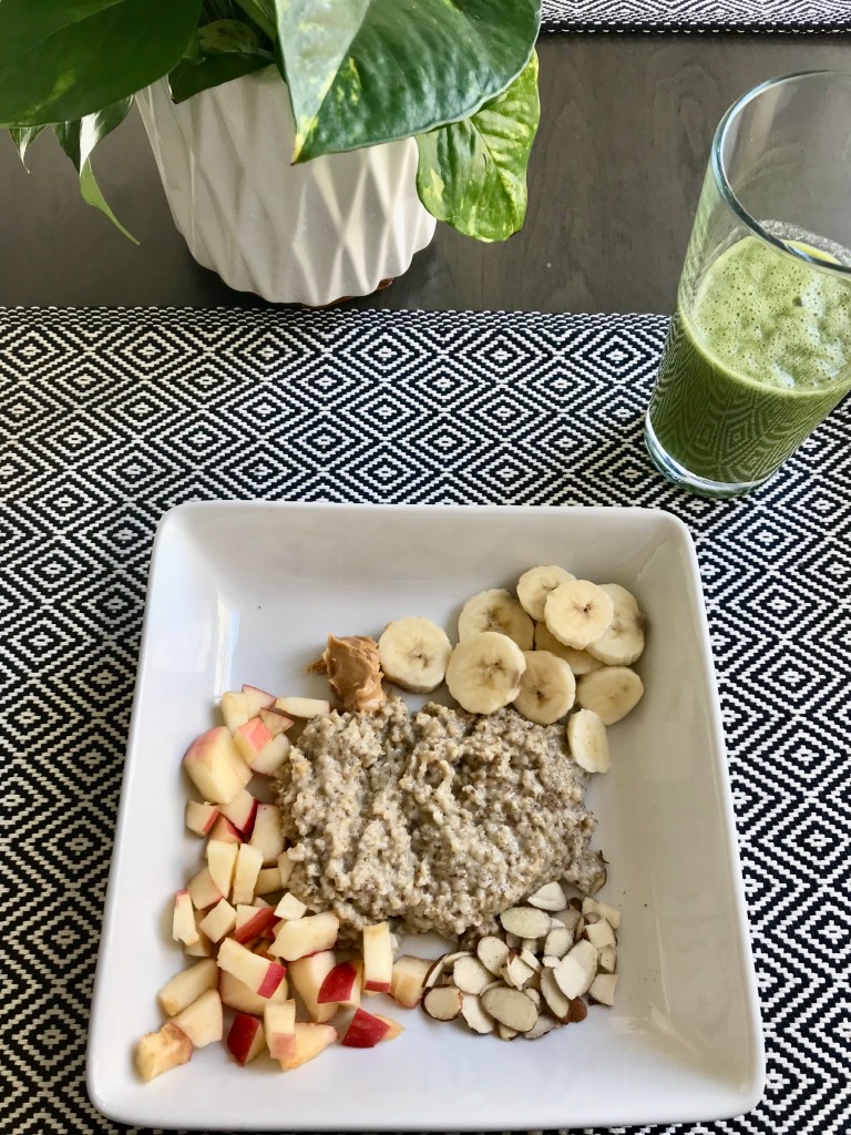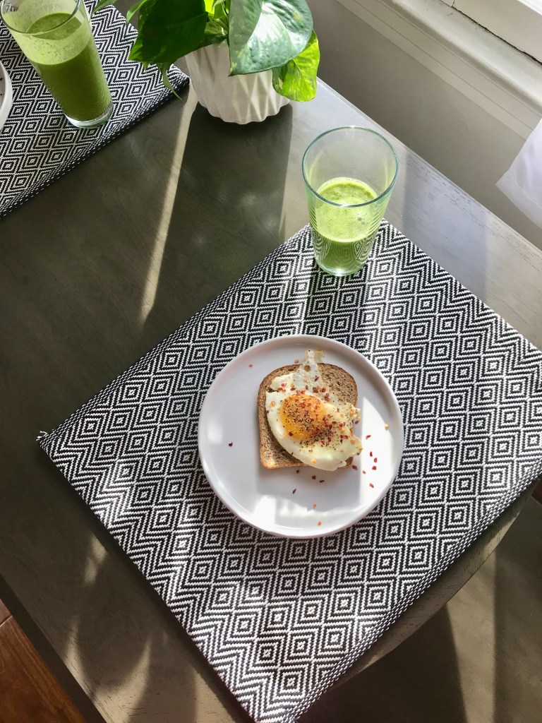 Don’t eat eggs? Try toast with peanut butter, jelly, avocado, or anything you do like. I like to pair this meal with a veggie and fruit smoothie.